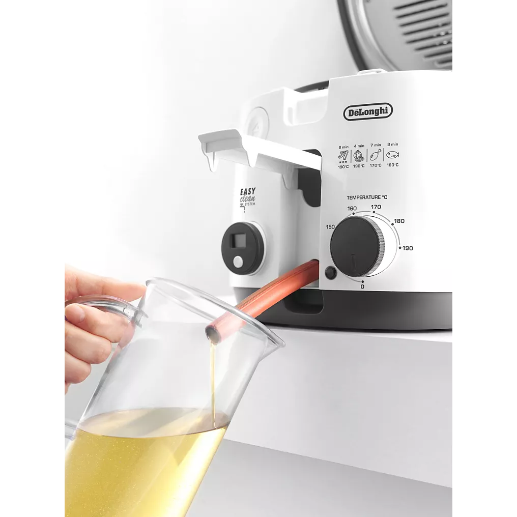 La Friteuse DELONGHI FS3053 est conçue pour être simple à manipuler. Le panier se soulève aisément grâce à une poignée ergonomique. Les parois restent suffisamment isolées pour limiter les risques de brûlure. L’appareil est stable et adhère bien au plan de travail.