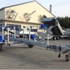 Cette remorque est spécialement conçue pour accueillir divers types de bateaux. Son système de supports réglables s’adapte aux coques de différentes formes. Les patins et rouleaux facilitent le positionnement et le maintien du bateau. Un cadre renforcé assure une répartition équilibrée du poids sur l’essieu. La remorque permet un transport fluide et sans secousses sur toutes les routes. Les éléments de fixation sont conçus pour garantir une stabilité maximale. Une excellente répartition du poids réduit l’usure des pneumatiques et essieux. Un design ingénieux optimise l’aérodynamisme et la consommation de carburant.